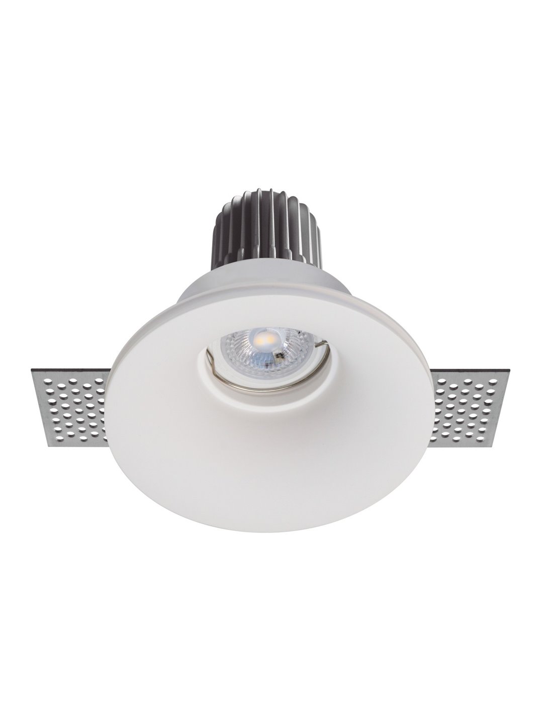 This downlight has a simple design, which allows it to be easily integrated into the ceiling. Its body is made of white plaster, which can be painted in the same colour as the ceiling for a perfect match. The format is circular and in it the light is the only protagonist, making it a suitable element for the minimalist style.