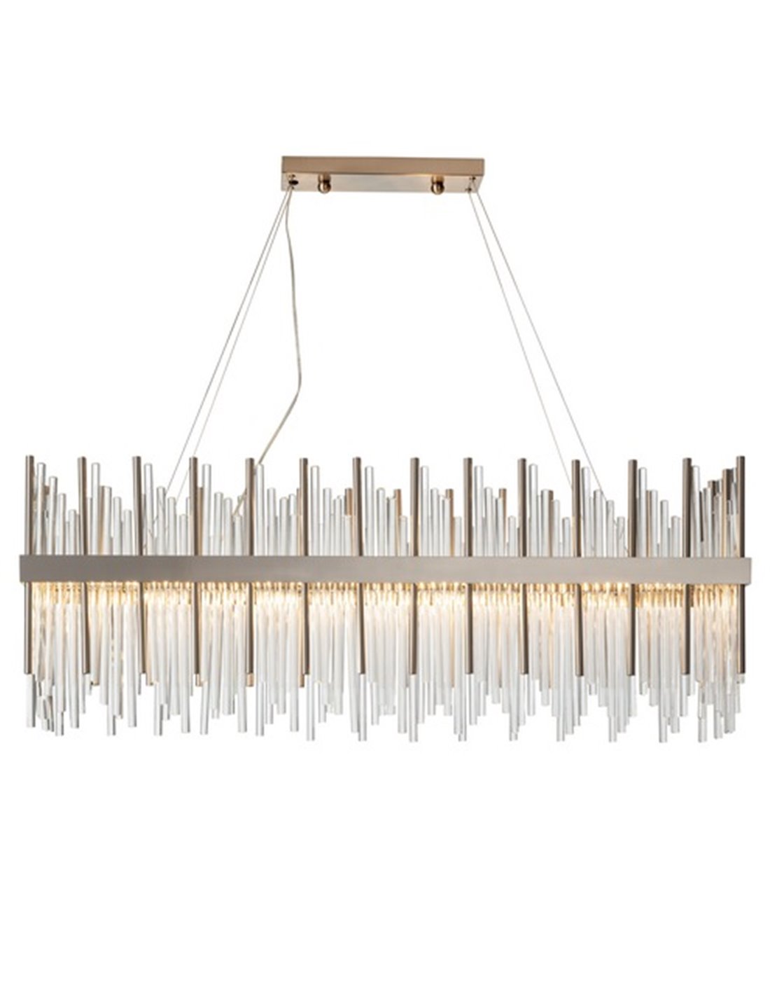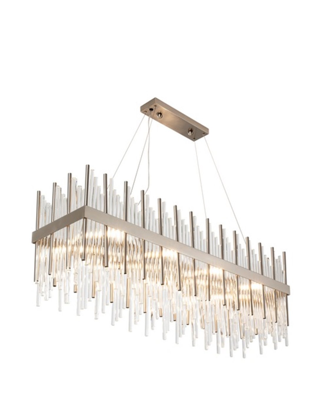 This pendant light, with a length of 105 cm, is a sophisticated piece that combines the elegance of vertical glass pieces with the robustness of a metal structure in satin chrome. This design is ideal for making an aesthetic statement in large living rooms, especially when placed above the main table.