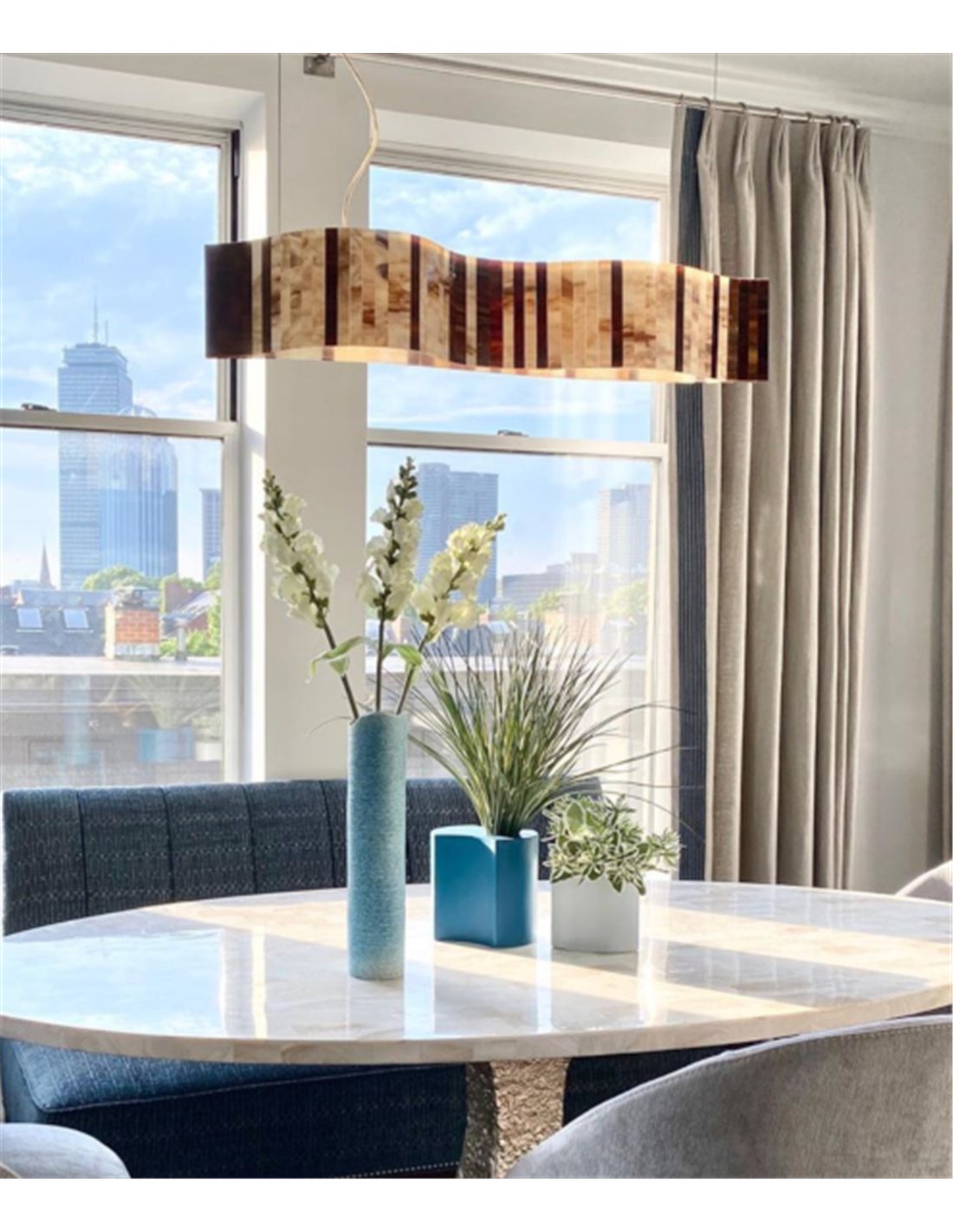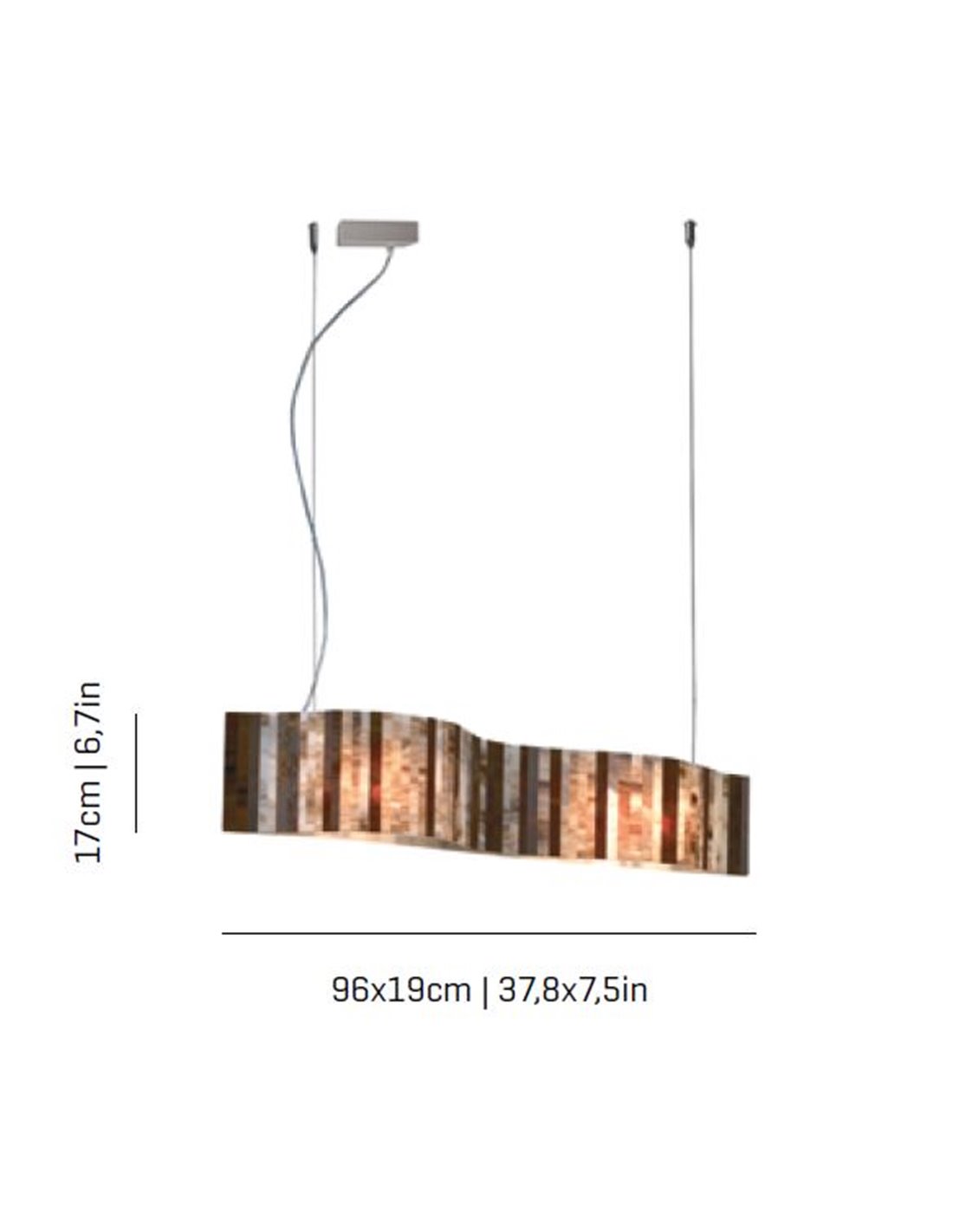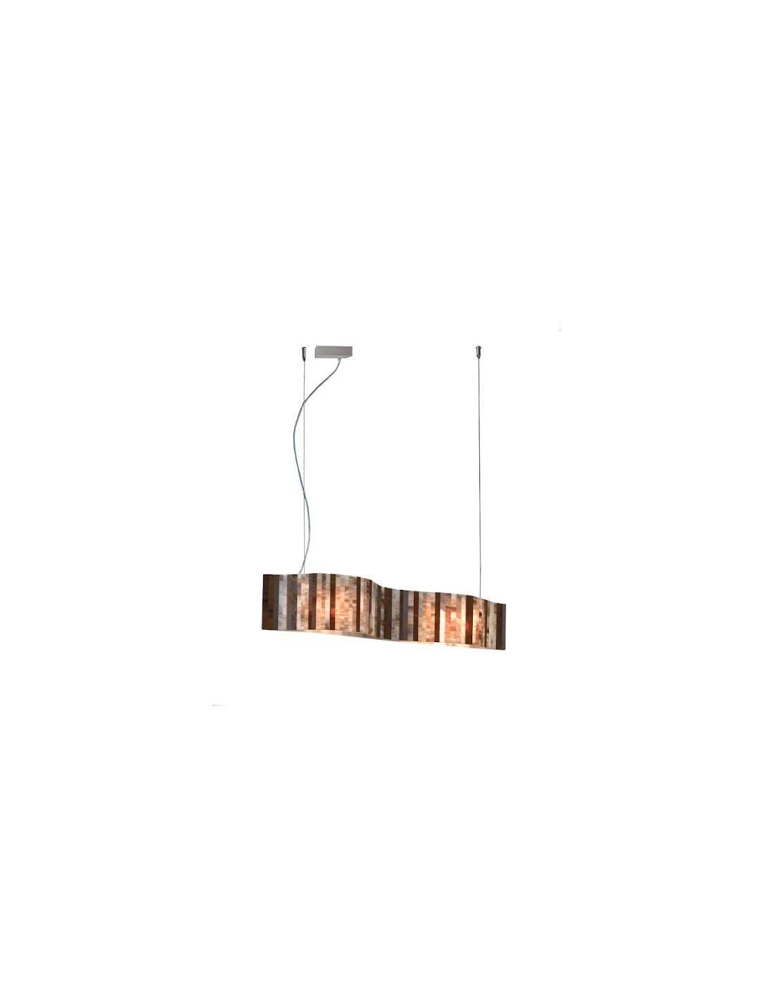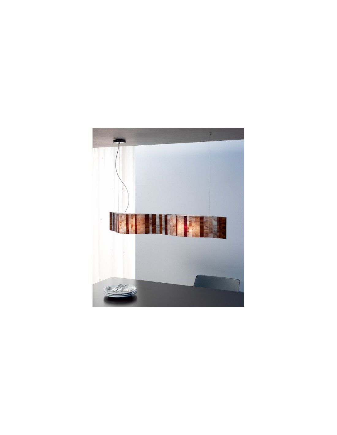 Vento is a ceiling pendant light in a horizontal format that is perfectly suited to illuminating the dining room table. Due to its considerable size (96 cm long and 19 cm wide), it is ideal for large tables where it will provide soft and cosy lighting, perfect for dinner parties. Its striking wavy shade is made of glass with a beige finish and is suspended on a transparent cable that allows the height of the luminaire to be adjusted up to 150 cm.