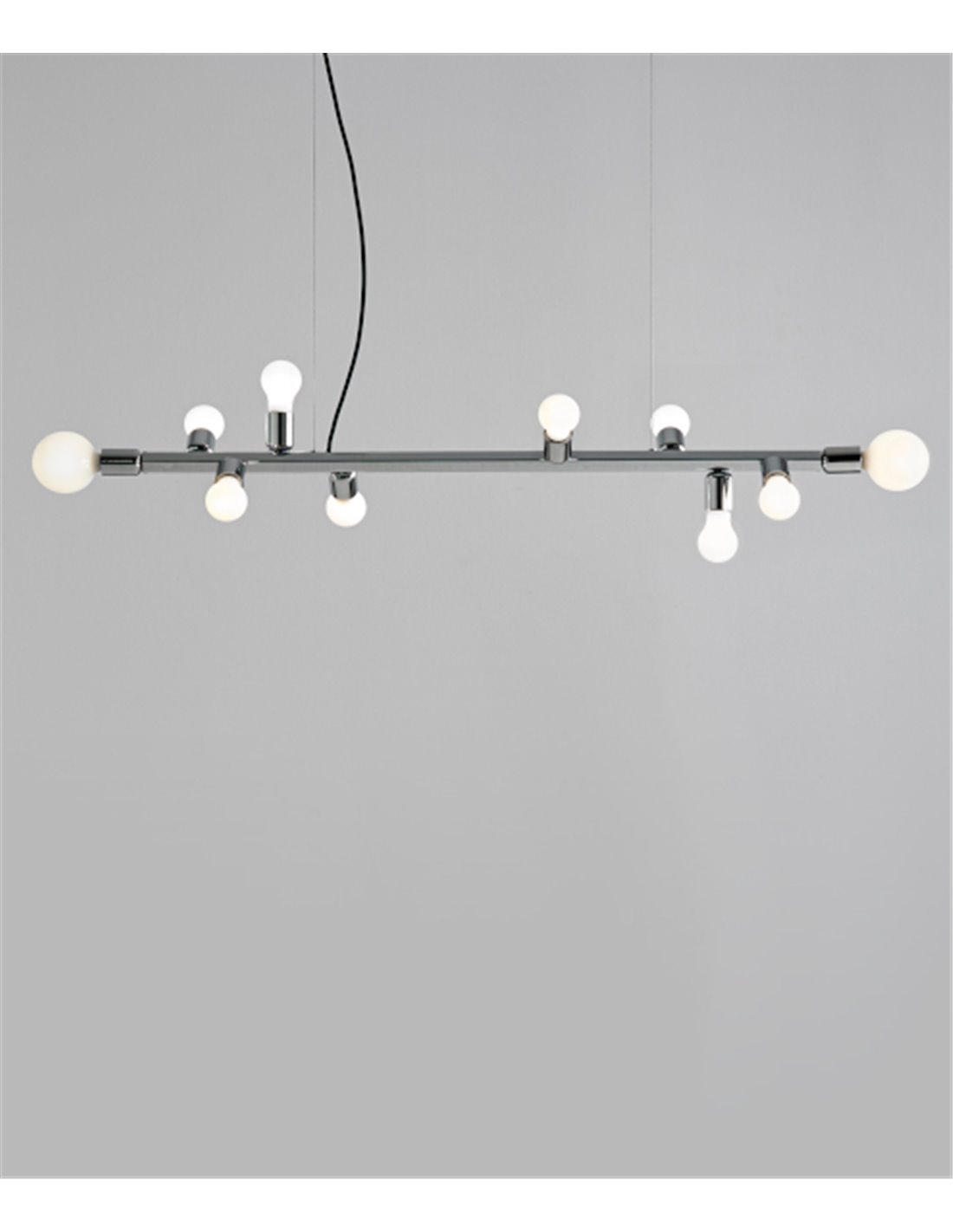 Party is a ball-shaped ceiling light with a design that can be adapted to different types of decoration. It is very functional, as its bulbs can be oriented according to the points to be illuminated. It is suspended from the ceiling by means of a finely chromed tube inside which the cable is placed.