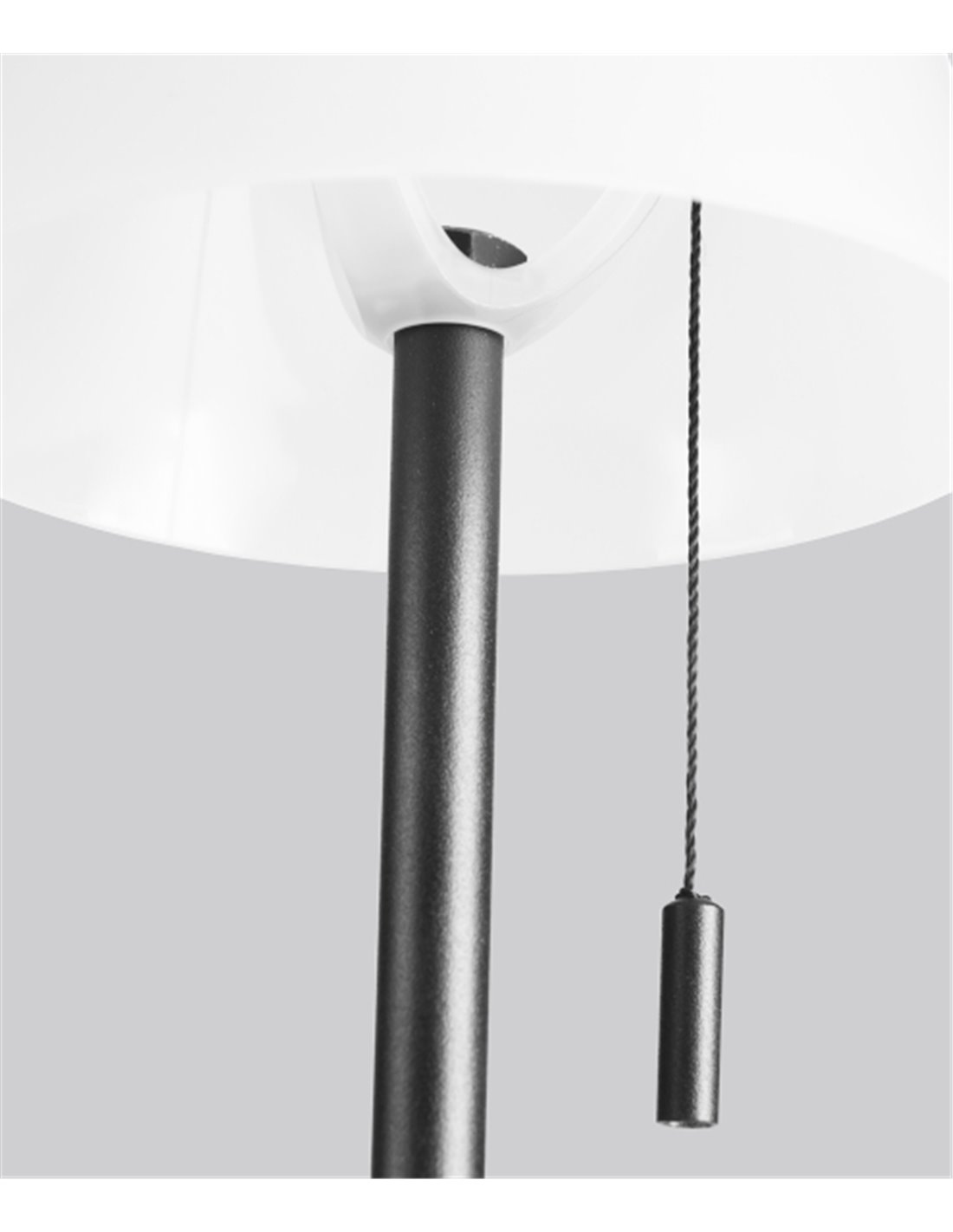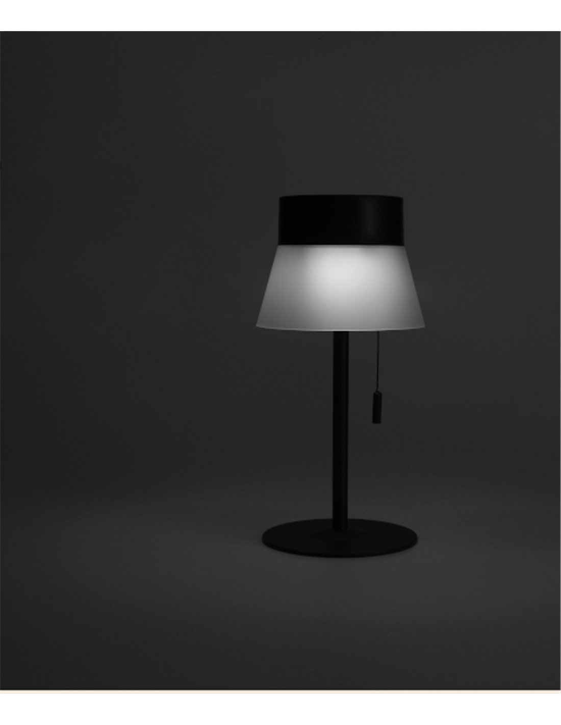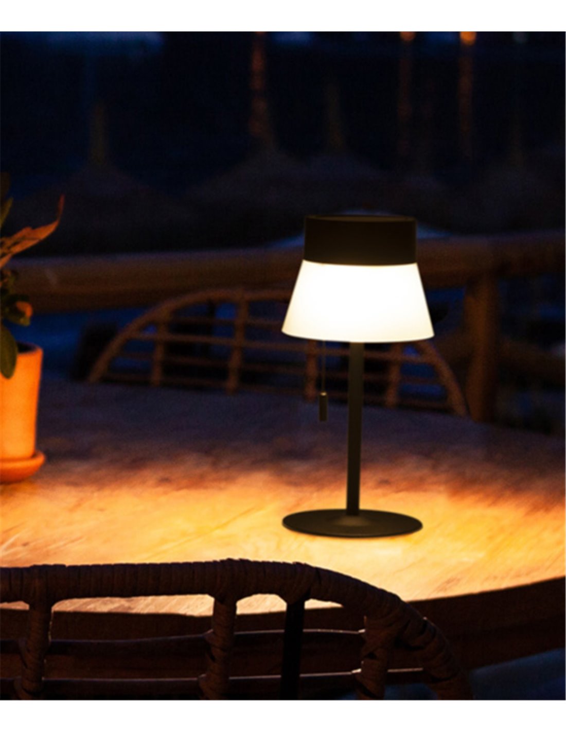 The Deco portable table lamp is perfect for illuminating outdoor spaces thanks to its IP54 rating, which guarantees its resistance to dust and splashing water. This solar lamp is designed with a cord to turn it on and off or to adjust its brightness. With the first touch, the lamp turns on at 100% brightness (4.5 hours duration), with the second touch it adjusts to 50% brightness (9 hours duration), and with the third touch it dims to 25% brightness (14 hours duration). With the fourth touch, the lamp is switched off.