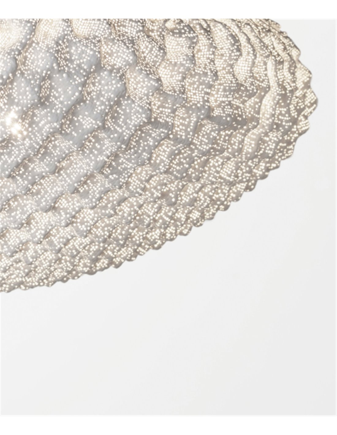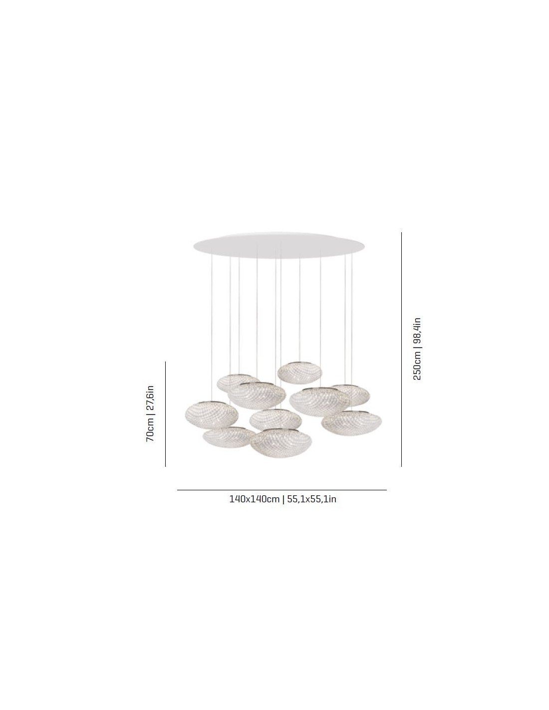 El conjunto de lámparas de techo de la colección Tati está compuesto por 6x TAO6G y 4x TAO6P, se oferta con la tulipa en acero inoxidable pintado con diferentes acabados entre los que elegir, blanco, beige, gris o topo, colores customizables según las necesidades del cliente, pudiendo combinar diferentes colores. Su florón es de Dibond. Este modelo tiene el cable transparente de una longitud customizable, por lo que permite adaptarlo a cualquier tipo de decorado de comedores y salones. Las dimensiones de esta lámpara colgante son 250cm de alto, en el cual las luminarias miden 70cm de alto, 140cm de ancho y 140cm de largo. Esta luminaria NO incluye la fuente de luz, recomendando bombillas de luz E14 LED vintage o standard con una potencia máxima de 20x7W.