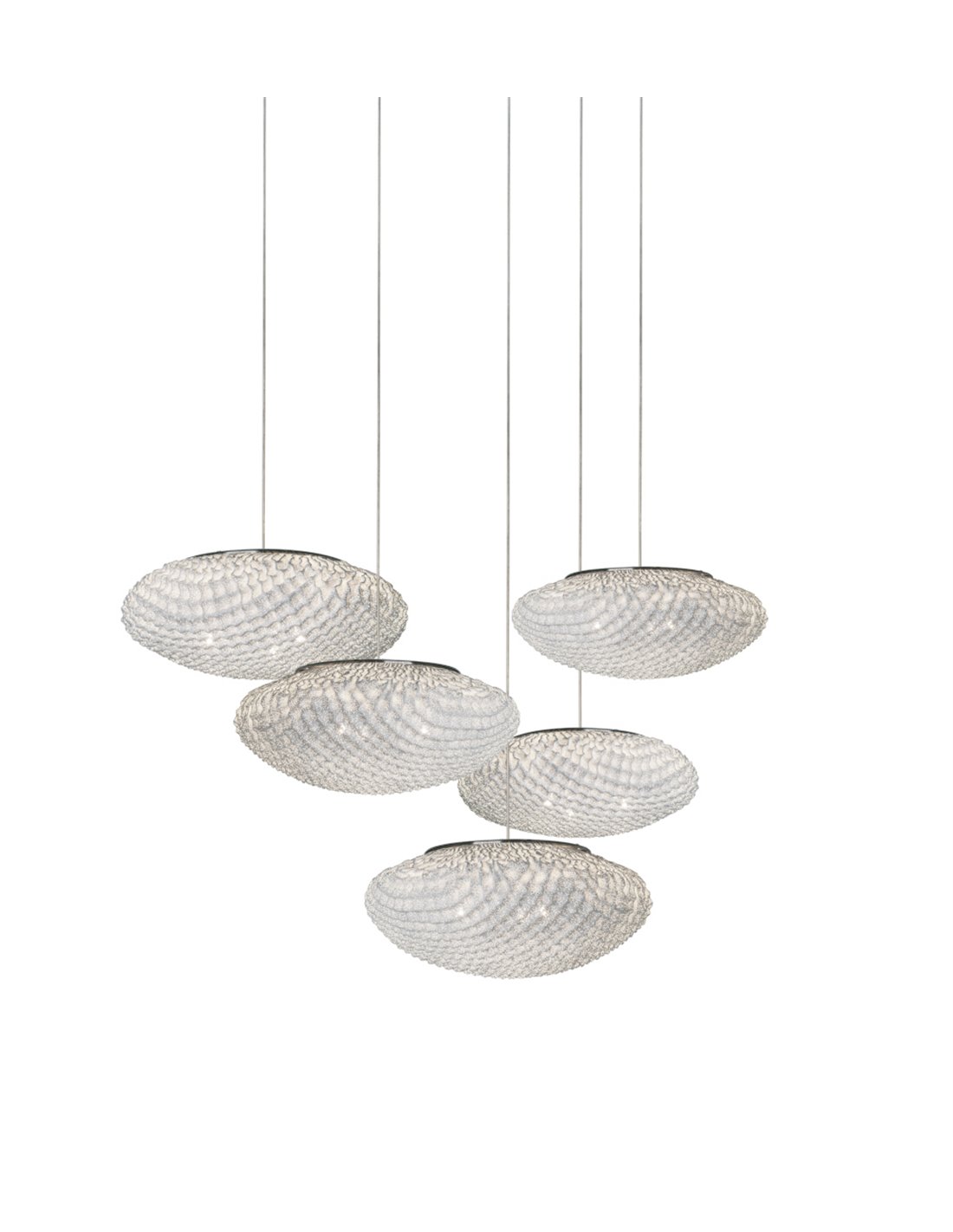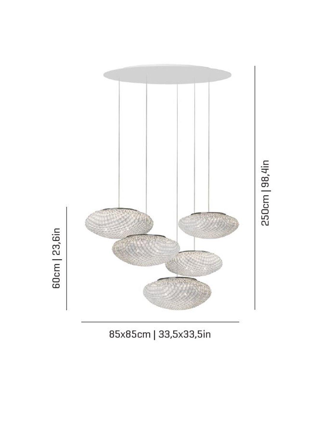 El conjunto de lámparas de techo de la colección Tati está compuesto por 3x TAO6G y 2x TAO6P, se oferta con la tulipa en acero inoxidable pintado con diferentes acabados entre los que elegir, blanco, beige, gris o topo, colores customizables según las necesidades del cliente, pudiendo combinar diferentes colores. Su florón es de Dibond. Este modelo tiene el cable transparente de una longitud customizable, por lo que permite adaptarlo a cualquier tipo de decorado de comedores y salones. Las dimensiones de esta lámpara colgante son 250cm de alto, en el cual las luminarias miden 60cm de alto, 85cm de ancho y 85cm de largo. Esta luminaria NO incluye la fuente de luz, recomendando bombillas de luz E14 LED vintage o standard con una potencia máxima de 10x7W.