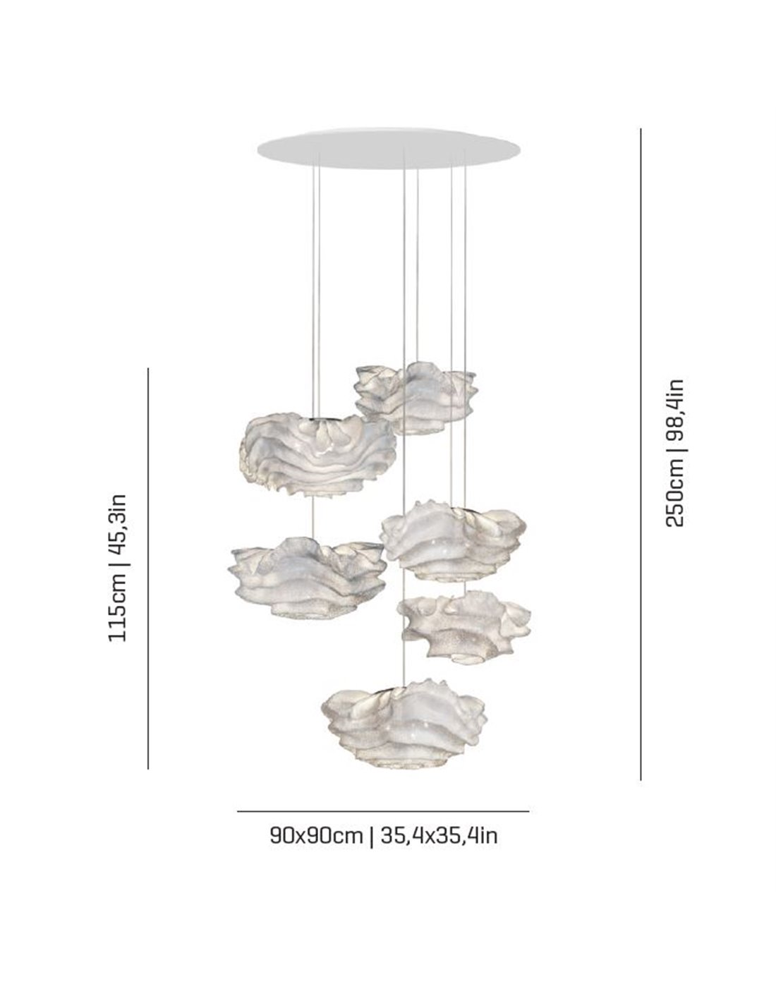 El conjunto de lámparas de techo de la colección Nevo está compuesto por 3x NEO4-1 y 3x NEO6P, se oferta con la tulipa en acero inoxidable pintado con diferentes acabados entre los que elegir, blanco, beige, gris o topo, colores customizables según las necesidades del cliente, pudiendo combinar diferentes colores. Su florón es de Dibond. Este modelo tiene el cable transparente de una longitud customizable, por lo que permite adaptarlo a cualquier tipo de decorado de comedores y salones. Las dimensiones de esta lámpara colgante son 250cm de alto, en el cual las luminarias miden 115cm de alto, 90cm de ancho y 90cm de largo. Esta luminaria NO incluye la fuente de luz, recomendando bombillas de luz E14 LED vintage o standard con una potencia máxima de 12x7W.