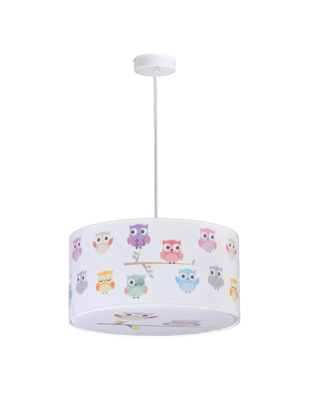 Children’s ceiling lamp of the Búhos collection by the brand Anperbar. It has an adjustable height, a PVC and textile lampshade and a pattern of different coloured owls. It measures 30x18cm, and uses a 26W E-27 max light source, which is not included. A table lamp model is also available.