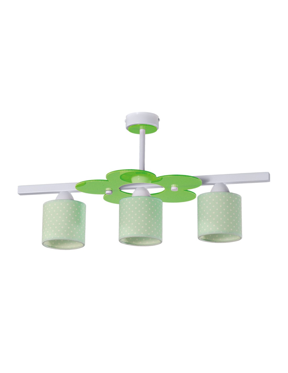 Children’s ceiling lamp from the ‘Topitos’ collection, with detail on the shape of a methacrylate flower. This luminaire is composed of a metal structure that joins its three shades made of PVC and textile. It is available in purple, pink and green, and all come with the same characteristics. Its dimensions are 65cm wide and 33cm high. Use 3 E-14 20W max bulbs, that are not included with the purchase of the product.