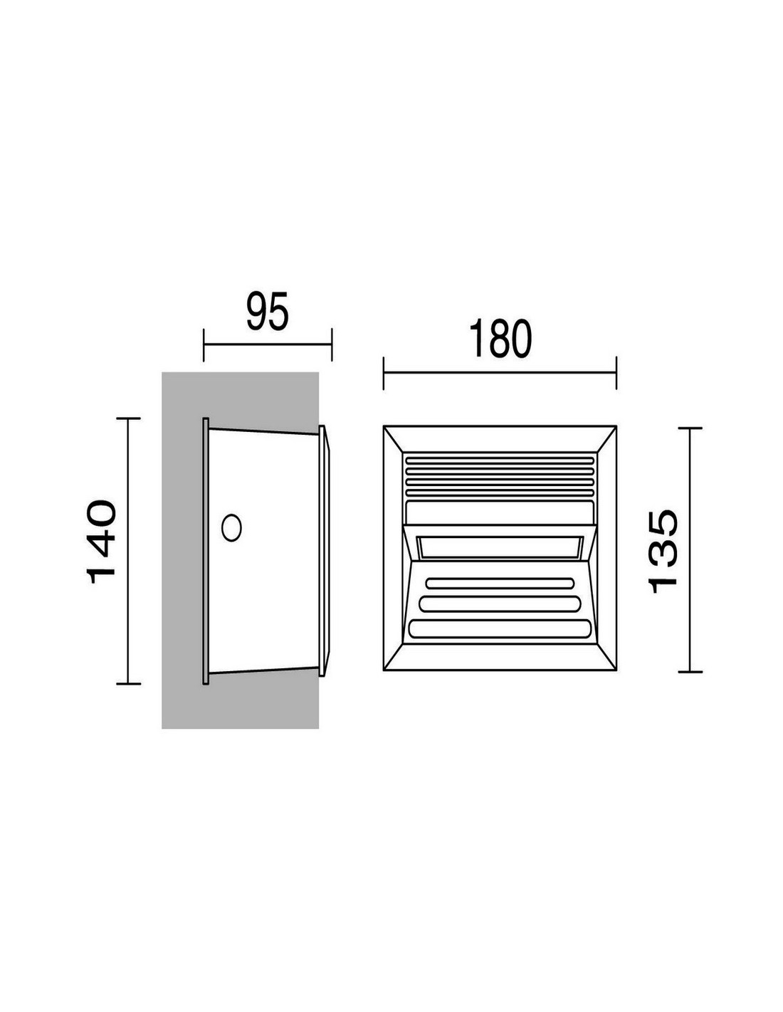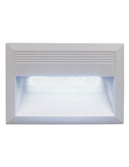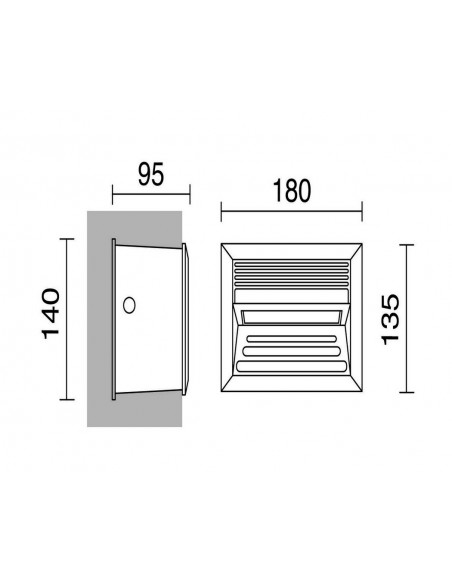 Recessed wall light from the ‘Dali’ collection. This wall luminaire is made from aluminum and has an opalized polycarbonate diffuser. It measures 18x9.5cm and has a height on 13.5cm, with a weight of 0.95kg. It includes the electrical equipment, the flush box and the light source, which is LED 1.8W 5200K.