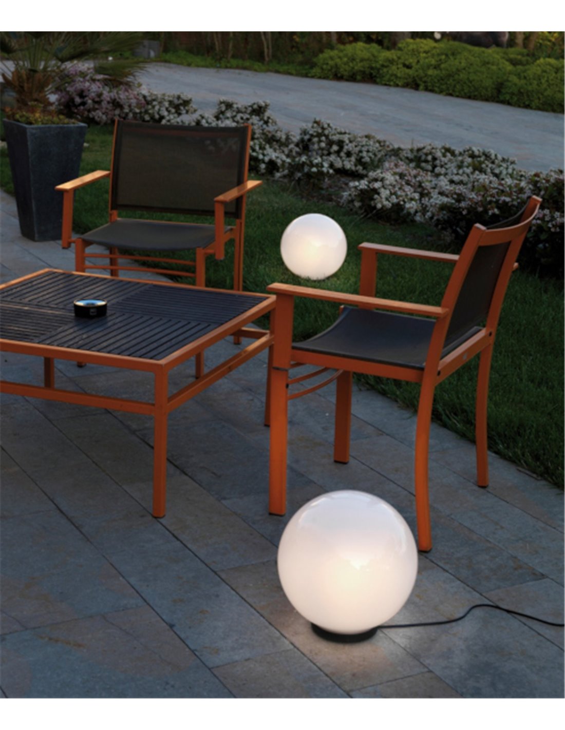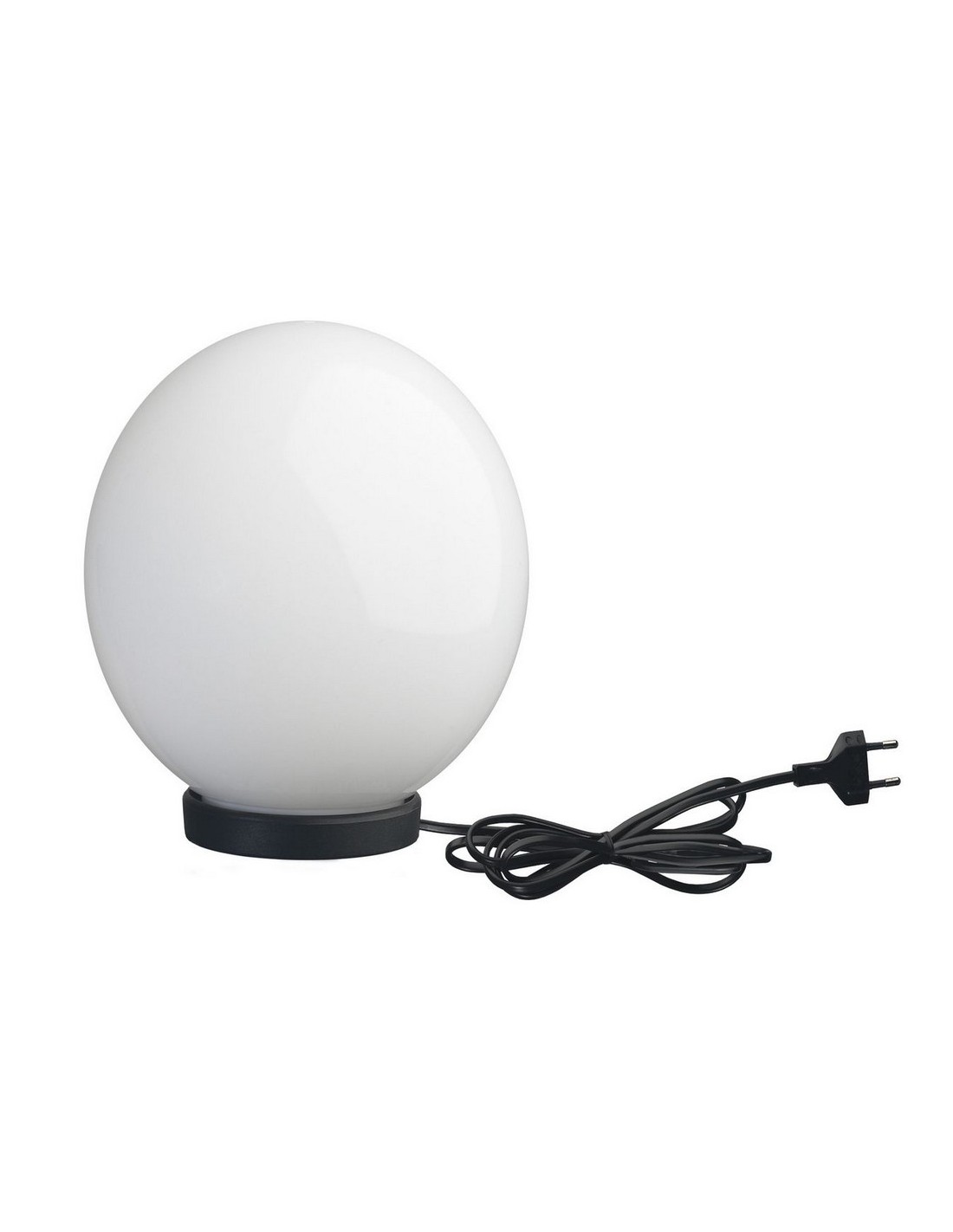 Floor lamp in a spherical shape from the ‘Glou’ collection, which has a body made of polyamide and it has an opalized polycarbonate diffuser. It has a 2m long cable and an IP 44 power socket, which gives it some resistance to water. Formed by a balloon with a bayonet closure and finished in black, it is available in 4 different sizes: 20x20 cm and a height of 20cm, 25x25 cm and a height of 25 cm, 30x30 cm and a height of 30 cm, and 40x40 cm with a height of 40 cm. Its weight varies between 0.65 Kg of the smallest model up to 2.65 Kg, going through the two intermediate models of 0.95 and 1.35 Kg respectively. Its voltage is 110-240V AC and is doubly insulated in the voltage parts, which does not require any grounding. It uses the light source E-27 LED/Fluo 15W in the smallest mdoel, E-27 LED/Fluo 23W in the 25x25cm model, and E-27 LED/Fluo 30W in the two larger products. The bulb is not included in any of the versions with the purchase of the product.