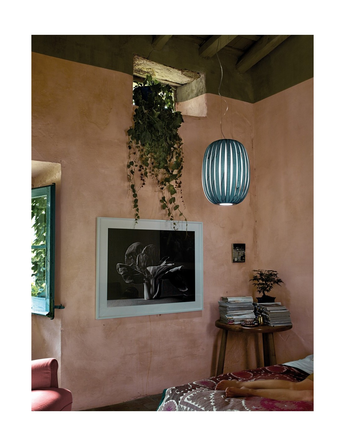 POD is a vertically elongated elliptical light orbit, whose body is composed of a repeated series of strips of wood veneer. Unlike POPPY, a small space between each strip of POD veneer allows barely a glimpse of its interior light. POD is a modern and stylish luminaire, with an attractive shape that smiles and illuminates its surroundings with an altruistic and fresh sense. It is a pendant that works well on its own or as part of a combination of several POD and POPPY lamps. Designed by Burkhard Dämmer for the Spanish manufacturer LZF, POD is available in a medium size of 61 cm height x 53 cm diameter and in various colours: yellow, blue, ivory white, natural cherry, chocolate, grey, natural beech, orange, red, pink and turquoise. This luminaire does not include a bulb, the recommended light source is E27 CFL 1 x 20 W max.