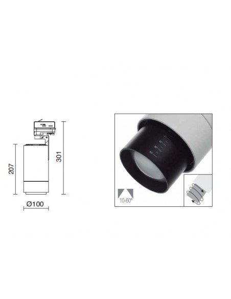 Enigma is a cylindrical shaped LED projector that comes with an adapter that enables use without the need for a rail. This ceiling spotlight has adjustable dispersion angle of 10º to 60º in order to offer the most adequate lighting for every desired environment. Its adjustability expands as it can be orientated and rotated up to 320º, which allows maximum mobility. This product is idea for use in shops, shop windows and exhibition areas. Its structure is made of white aluminium, it has a transparent glass diffuser and reflector made in metallic, facetted polycarbonate.