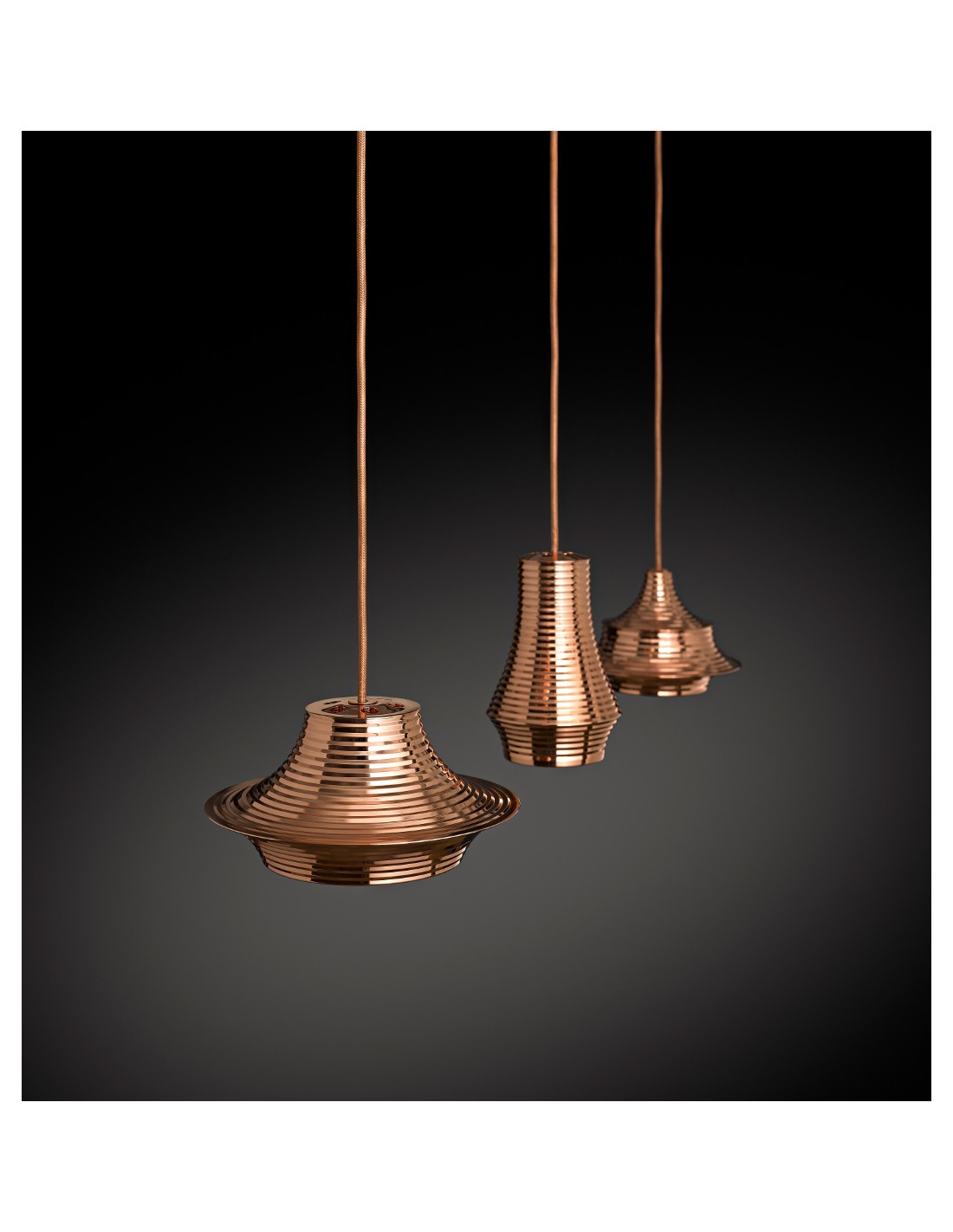 The Bover brand wanted to highlight through this collection that the curves and geometric shapes never go out of fashion and are always present today offering a great decorative contribution. The ‘Tibeta’ family is made up of different versions of suspension lamps made from turned aluminium which gives them a modern and attractive appearance. It is a set of 3 units joined by a linear structure. The whole piece is covered by a copper electrolytic bath and metal wires in the same colour to give uniformity to the whole set. The light source is LED 30,4W 2155lm with 2900-3200º of colour temperature (the bulbs are included).