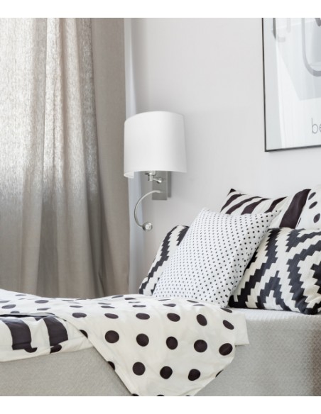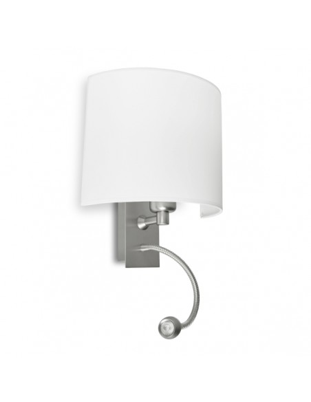 This wall light manufactured by Pujol Iluminación combines direct light with a more subdued and diffuse lighting. The great functionality that it presents thanks to the integrated flexo makes that it is not necessary to resort to a second lamp, in moments of reading the flexo provides suitable light orienting the head of more wished form and if it is wished simply to illuminate the room of a more intimate way, the light coming from its screen will fulfill that function. The design of this lamp is very elegant, especially because of the contrast between the white fabric that forms the lampshade and the chrome-finished steel structure. Regarding the light source, the flexo is integrated by 3W 195lm 3000K LED technology and the luminaire houses a 1 X E-27 PL 15W + 1 bulb (not included).