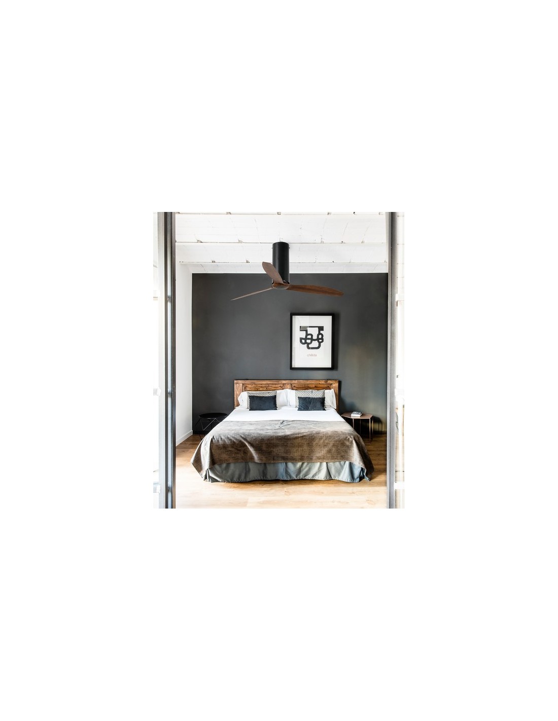 TUBE FAN is the cylindrical version of JUST FAN. This modern ceiling fan is ideal for rooms between 13m2 and 17m2. Remote control operated, included. This ceiling fan with a low consumption DC motor has 6 adjustable speeds with a consumption of 4-6-9-13-22-32W and 51-77-103-129-155-185 revolutions per minute according to speed. This fan has a reverse summer-winter function, so you can use it also in winter improving the efficiency of your heating system. Air flow: 145.7 m3 min / 5145 CFM. It is available in 7 different finishes: chrome, glossy white, matt white, glossy black, matt black, all with transparent blades; matt black with wooden blades and finally, full matt black fan.