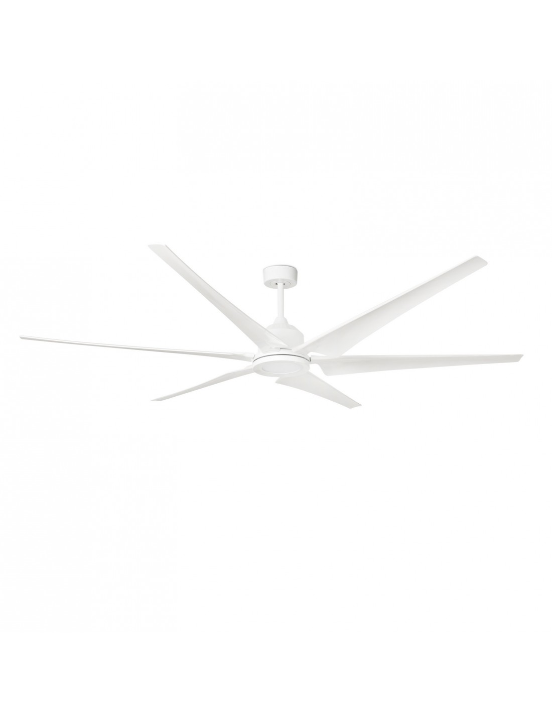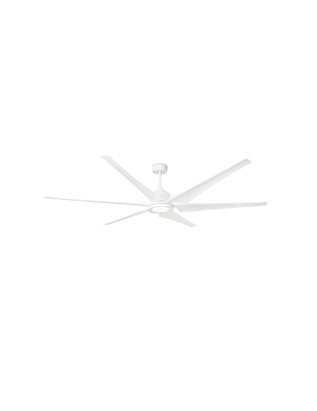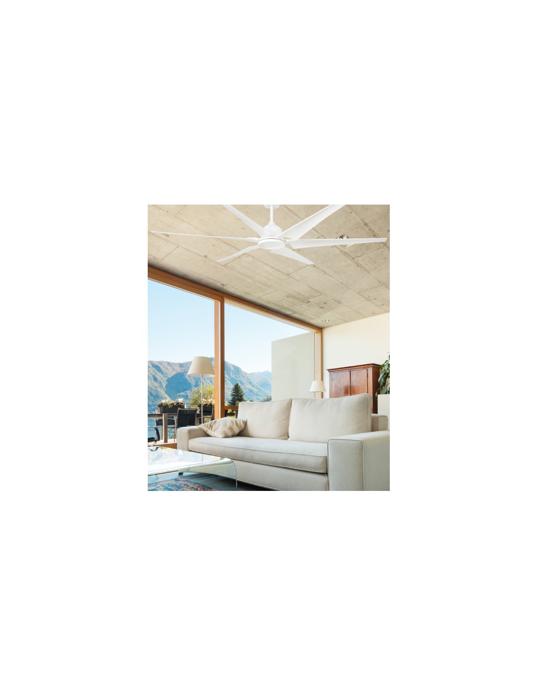 Ceiling fan with 6 ABS blades and steel DC motor belonging to the ‘Cies’ family of the Faro Barcelona lighting brand. This fan is composed of modern lines and finished in a white tone, simple and can be combined with any design of your rooms, is available without light source or with an integrated LED light source that has 18W 900lm 3000K. In terms of dimensions, ‘Cies’ reaches 43 centimetres in height, with a diameter of 210 centimetres and a total net weight of 11 kilograms, ideal for rooms larger than 28m2. Suitable for inclined ceilings, it has 5 speeds that can be adjusted by a remote control included, whose consumption ranges from 6W to 44W, depending on the revolutions per minute.