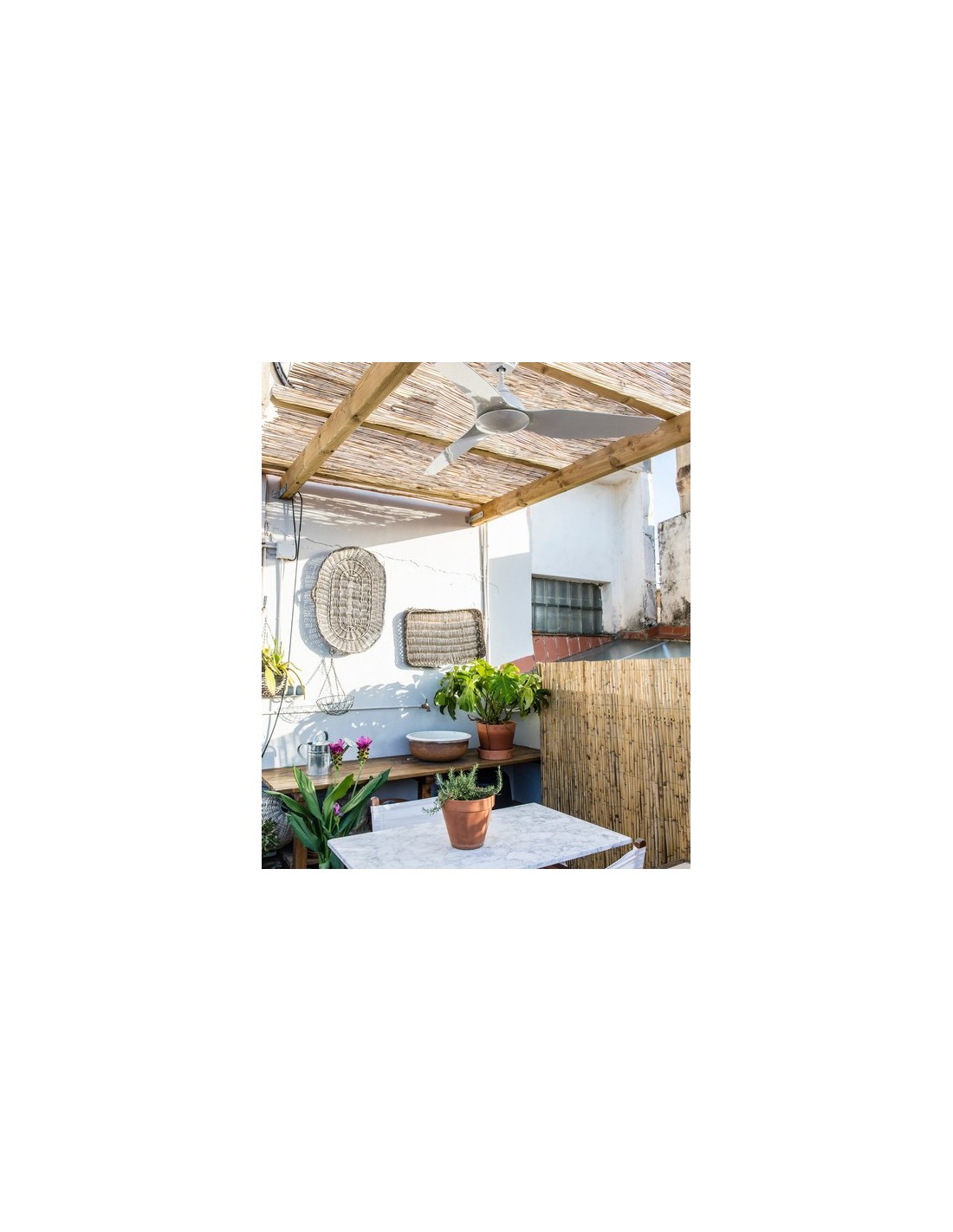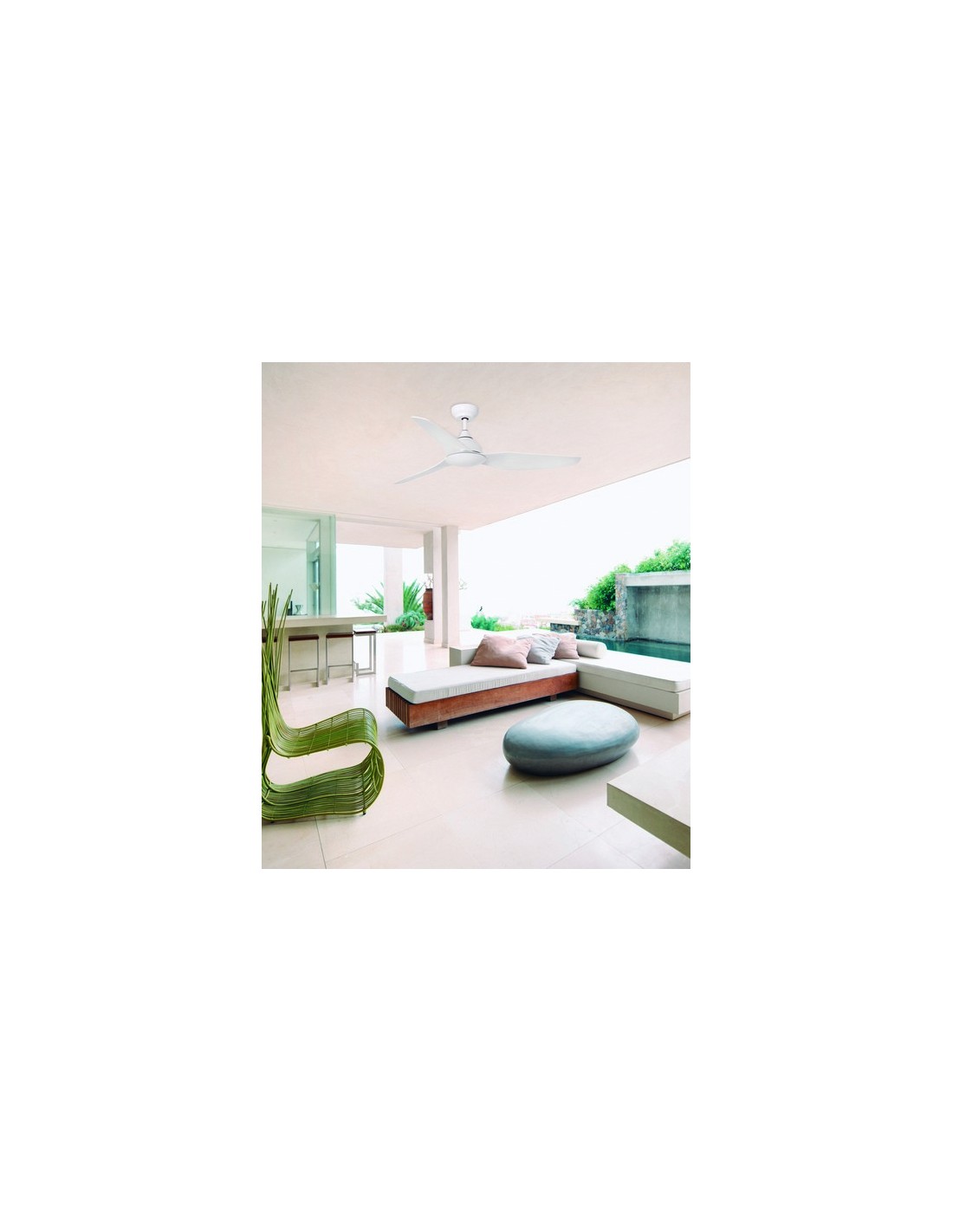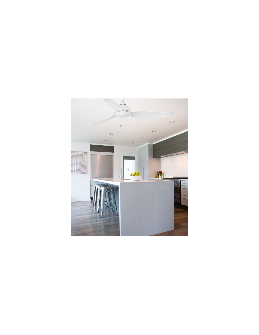 White ceiling fan with modern line DC motor. For rooms from 13 m2 to 17.6m2. Remote control operated, included. It has 5 adjustable speeds with a consumption of 5-10-16- 23-38 2W and 106-143-174-198-233 revolutions per minute according to speed. This fan has an inverse function. It includes two shafts. Air flow: 164,32 m3 min / 5803 CFM.