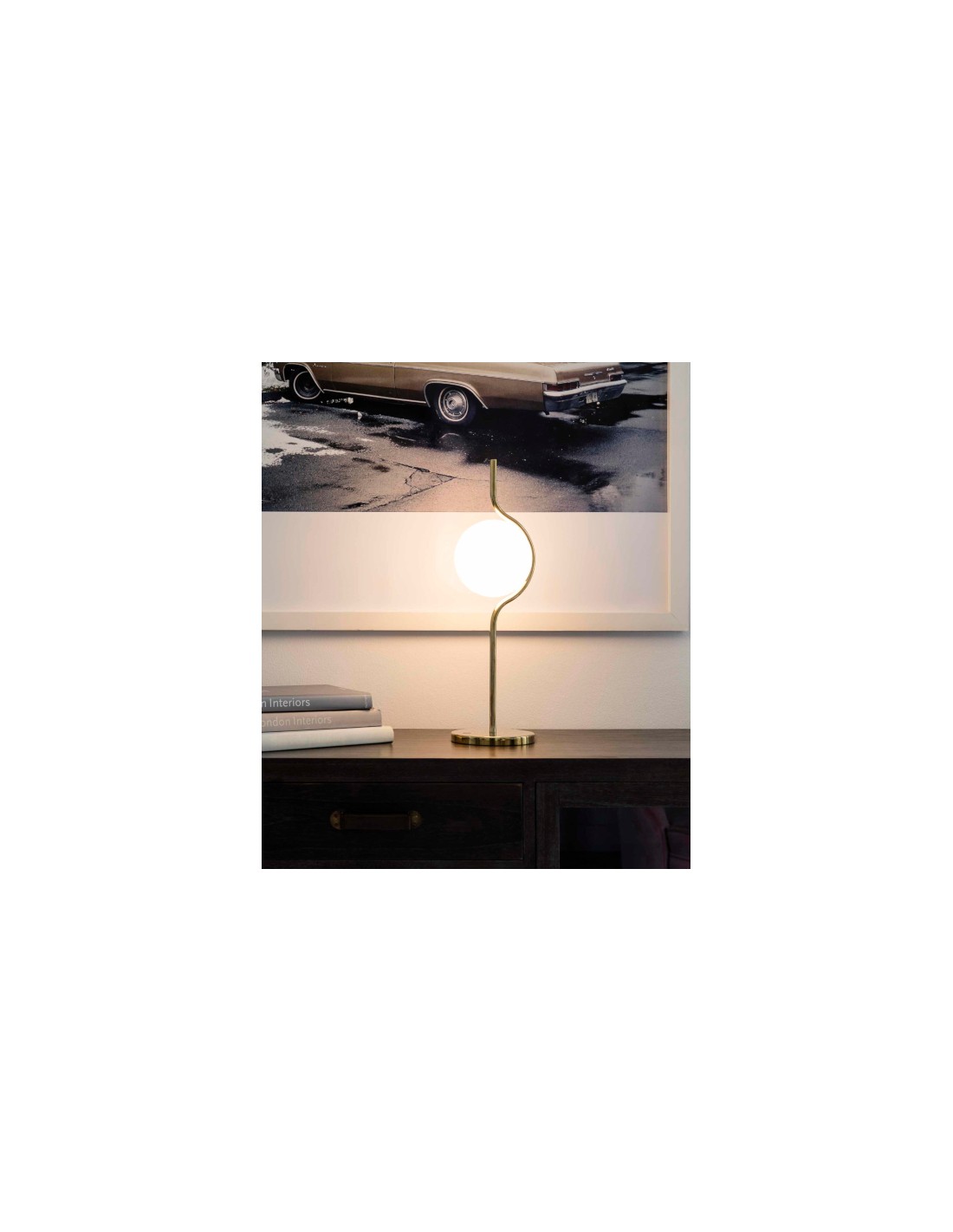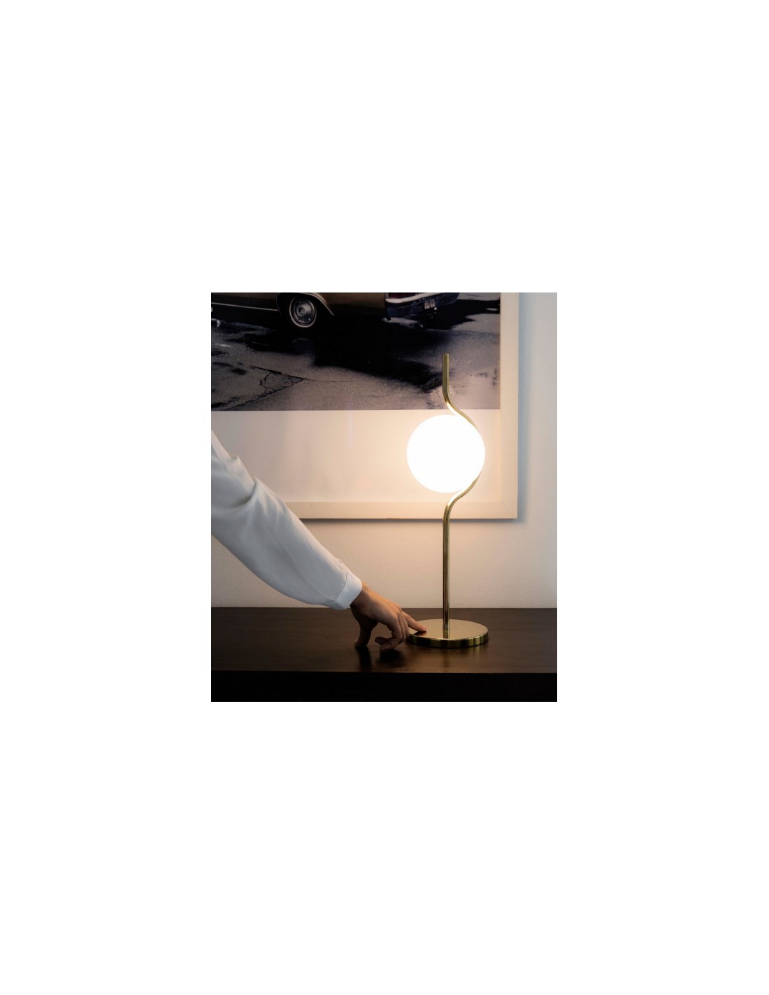 The design of this tabletop luminaire designed by Nahtrang is delicate and simple, combining the fine lines of its gold-coloured structure with the opal glass diffuser. It measures 15 cm long, 20 cm wide and 58 cm high. Its light source is LED 6W 2700K 570lm and the bulb is included.