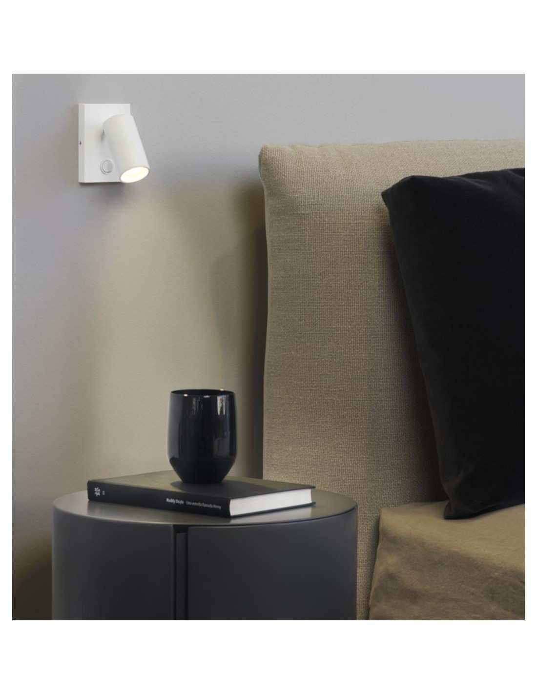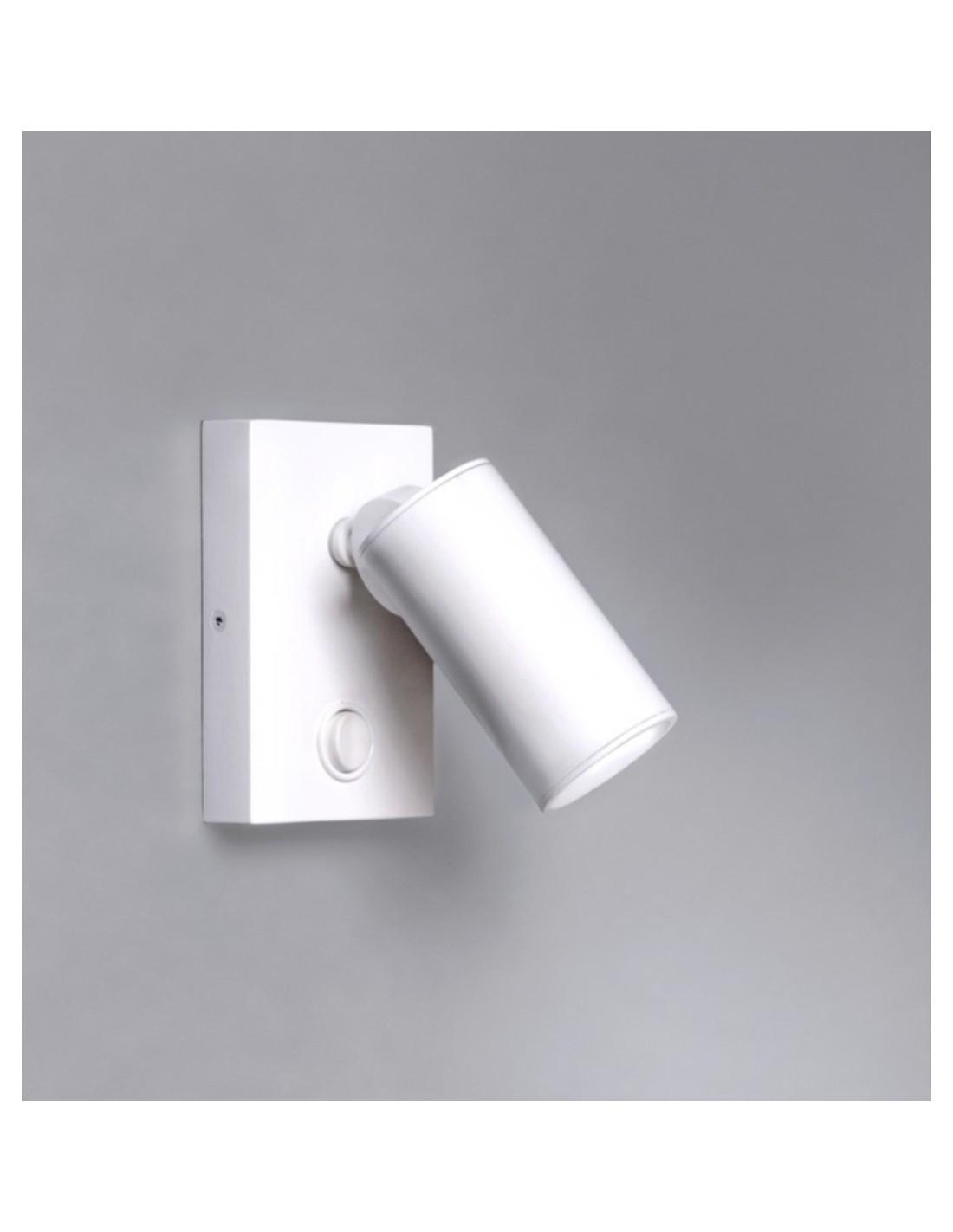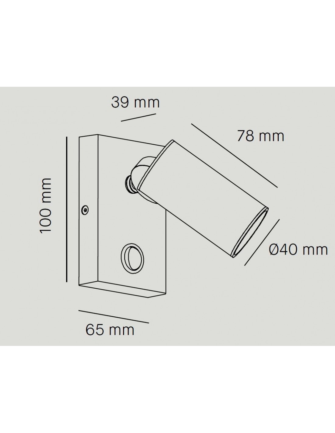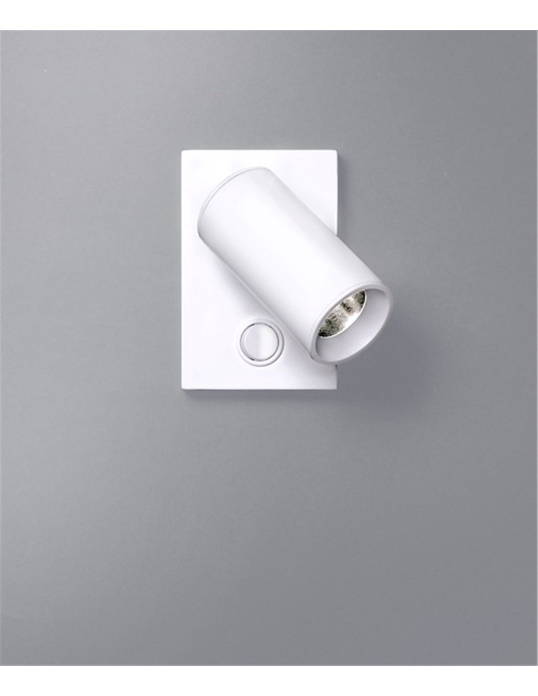 Wall sconce composed of a rectangular base that supports the luminaire to the wall and also has the switch to facilitate on/off, and a spotlight orientable in any direction that emit light thanks to the source of LED lighting It has integrated, whose characteristics are 5W 500lm 2700K (warm light). Useful for living rooms or bedrooms in order to use it as a reading lamp, this spotlight has the following measures: 4 cm in diameter and 7.8 cm high in the spotlight, and width of 6.5 cm and 11.7 cm total height.